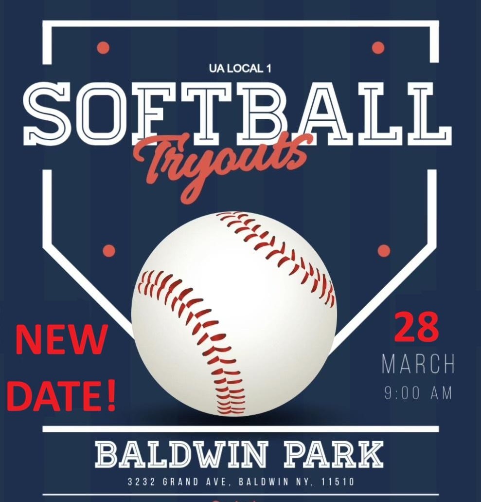 The Plumbers Local 1 Softball Team will host highly competitive tryouts at 9am on Saturday, March 28, 2026, at Baldwin Park, 3232 Grand Avenue in Baldwin, NY. Call Joe Esposito at (516) 652-9134 or Chris Appell at (516) 965-5539 with any questions.