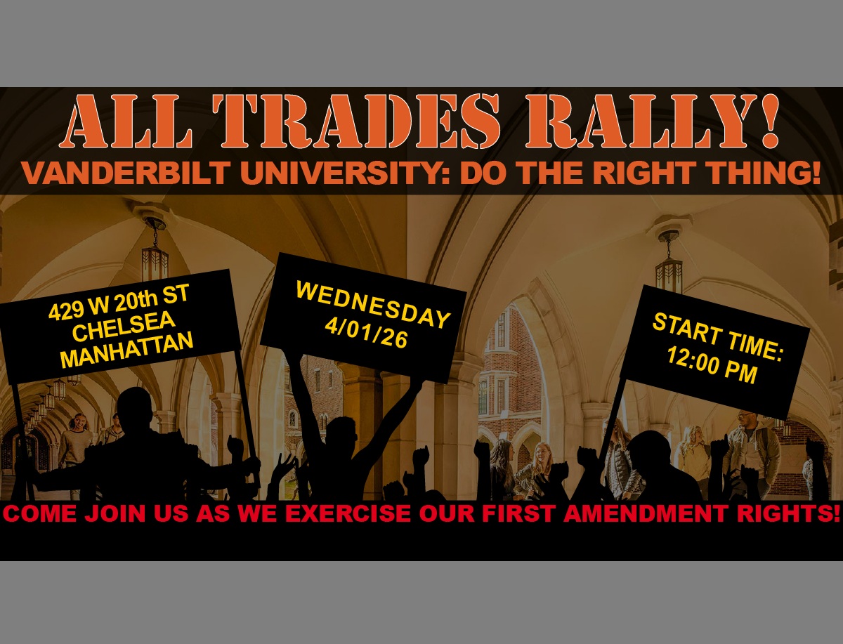 Vanderbilt University must do the right thing and ensure their New York City campus project is completed by the trained, qualified union workers who can deliver safe, reliable construction. The Building Trades are standing together to demand that this project moves forward with the workforce it deserves.