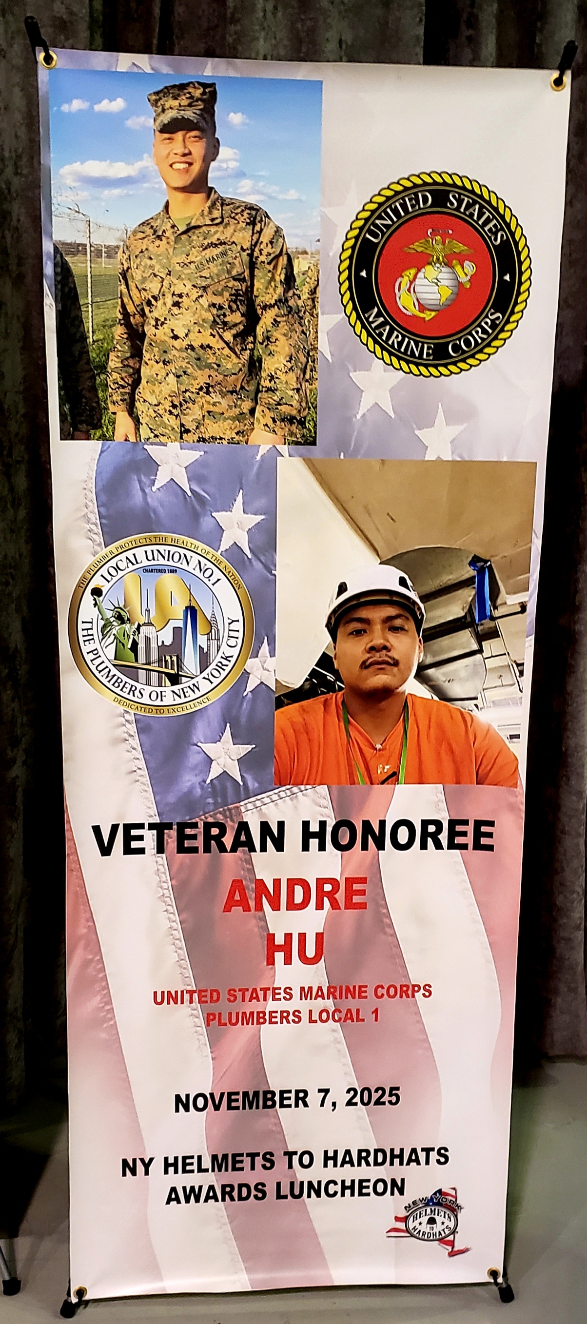 On Friday, NY Helmets to Hardhats held its 2025 Awards Luncheon aboard the Intrepid Air and Space Museum. Among those recognized was Plumbers Local 1 Apprentice Andre Hu, honored for his service as a U.S. Marine and his dedication to the Trade.